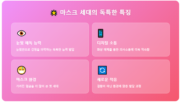 2020년 팬데믹 이후 태어나 생애 초기 2~3년을 마스크 착용이 일상화된 환경에서 보낸 아이들은 이전 세대와는 확연히 다른 발달 경험을 하고 있습니다. 이들은 인류 역사상 처음으로 타인의 얼굴 절반이 가려진 모습을 더 많이 접한 세대입니다. 마스크로 인해 입 모양과 미소를 제대로 관찰할 기회가 제한되었고, 외출과 또래와의 만남도 현저히 줄어들었습니다. 하지만 이것이 발달의 결함을 의미하는 것은 아닙니다. 오히려 이 아이들은 눈빛만으로 감정을 파악하는 독특한 능력을 키웠고, 디지털 매체를 통한 의사소통에 더욱 익숙한 모습을 보입니다. 표정 인식 능력, 사회적 상호작용 방식, 언어 습득 과정에서 차이를 보이는 것은 새로운 환경에 대한 적응의 결과입니다. 어린이집 입학을 앞둔 부모라면 이러한 특성을 먼저 이해하고 받아들이는 것이 중요합니다.