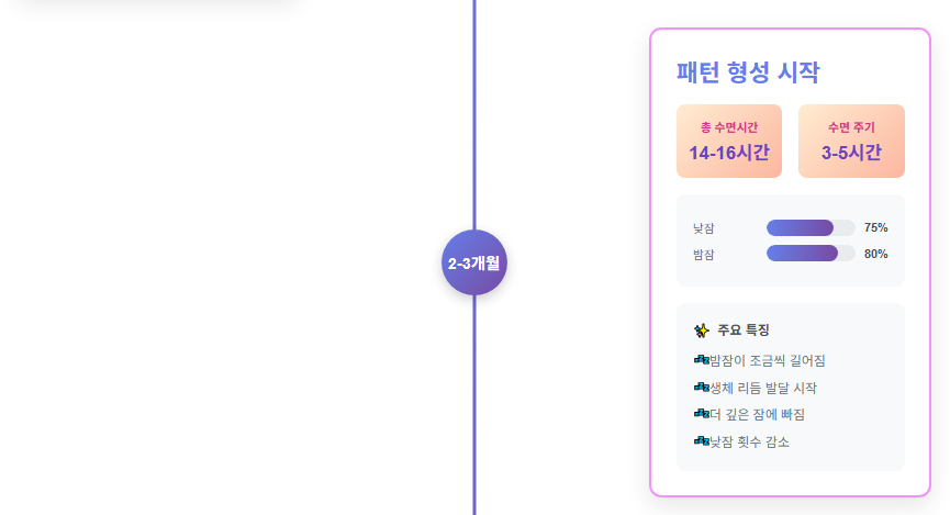 뇌 발달과 함께 멜라토닌 분비가 시작되면서 점차 밤과 낮을 구분하는 능력이 생기기 시작하며, 밤에 자는 시간이 점진적으로 길어지는 경향을 보입니다.