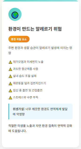 셋째, 환경 오염 물질 노출입니다. 미세먼지, 대기 오염 물질, 실내 유해 물질(곰팡이, 집먼지 진드기 등)은 호흡기 알레르기뿐만 아니라 식품 알레르기에도 영향을 미칠 수 있습니다.