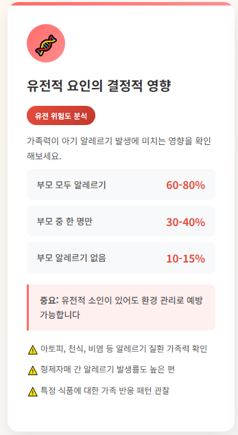 부모 중 한 명이라도 알레르기 질환(아토피 피부염, 천식, 알레르기 비염, 식품 알레르기 등)이 있다면, 아이가 알레르기를 앓을 확률은 2배 이상 높아집니다.