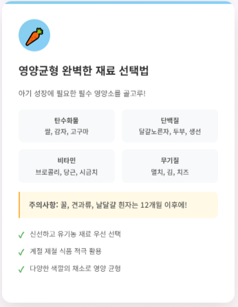 - 제철 재료 활용: 제철 과일과 채소는 영양가가 가장 풍부하고 맛도 좋습니다. 같은 채소라도 제철에 나는 것을 사용하면 아기가 더욱 잘 먹을 수 있습니다.