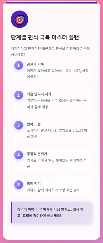 편식은 단기간에 해결하기 어려운 문제이며, 부모님의 인내심과 긍정적인 태도가 가장 중요합니다.